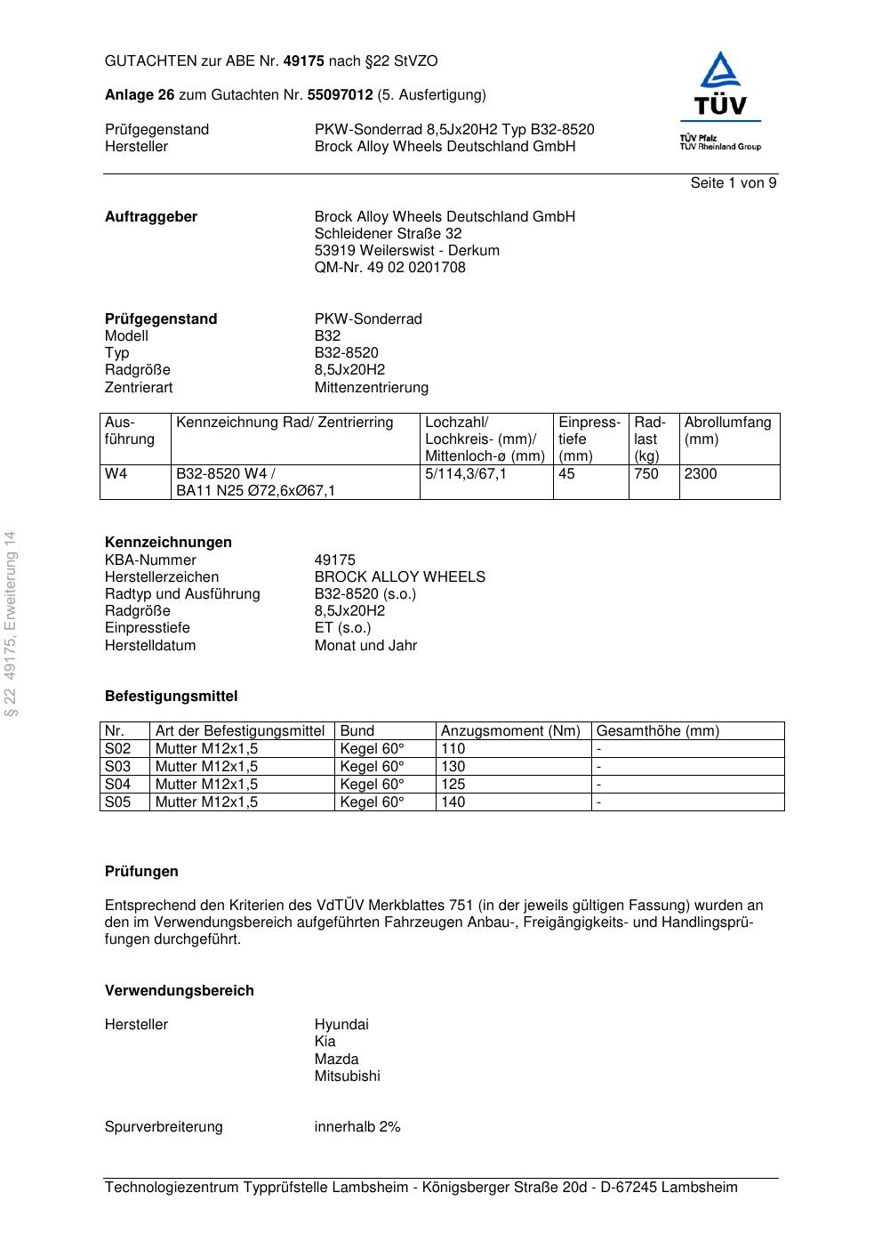 Dieses Gutachten (abe) bezieht sich auf die Alufelge Brock B32-8520 in der Ausführung 8.5Jx2 ET 0, Mittenloch 0 mm (KBA 49175). Im PDF findest du typischerweise zulässige Reifengrößen, Auflagen/Anbauhinweise und – je nach Dokument – Hinweise zur Eintragung.