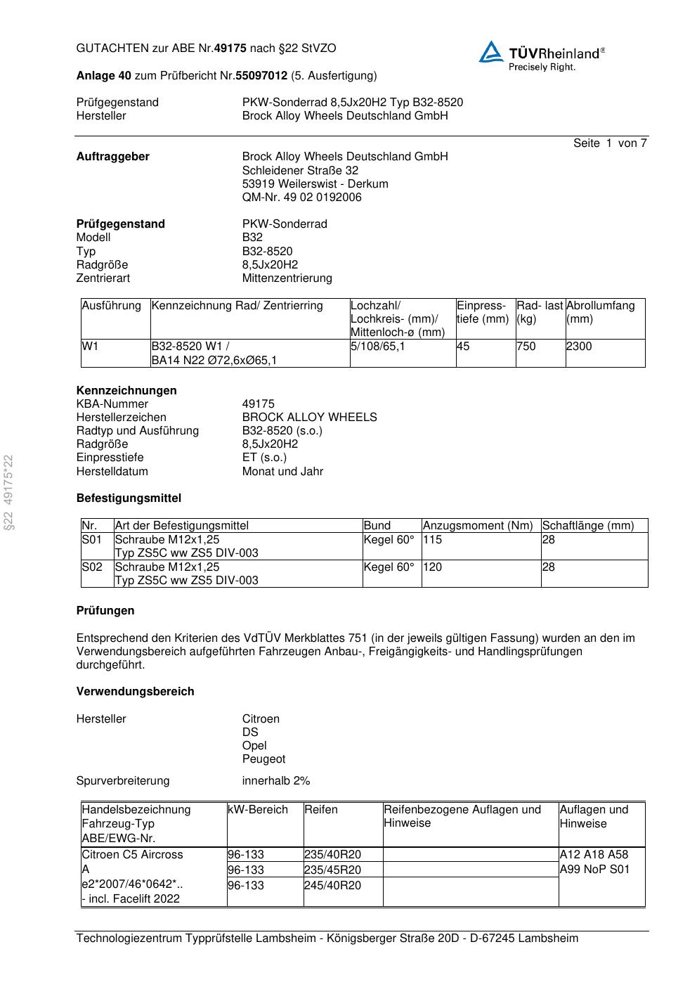 Dieses Gutachten (abe) bezieht sich auf die Alufelge Brock B32-8520 in der Ausführung 8.5Jx2 ET 0, Mittenloch 0 mm (KBA 49175). Im PDF findest du typischerweise zulässige Reifengrößen, Auflagen/Anbauhinweise und – je nach Dokument – Hinweise zur Eintragung.