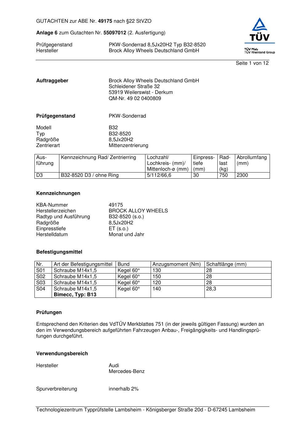 Dieses Gutachten (abe) bezieht sich auf die Alufelge Brock B32-8520 in der Ausführung 8.5Jx2 ET 0, Mittenloch 0 mm (KBA 49175). Im PDF findest du typischerweise zulässige Reifengrößen, Auflagen/Anbauhinweise und – je nach Dokument – Hinweise zur Eintragung.