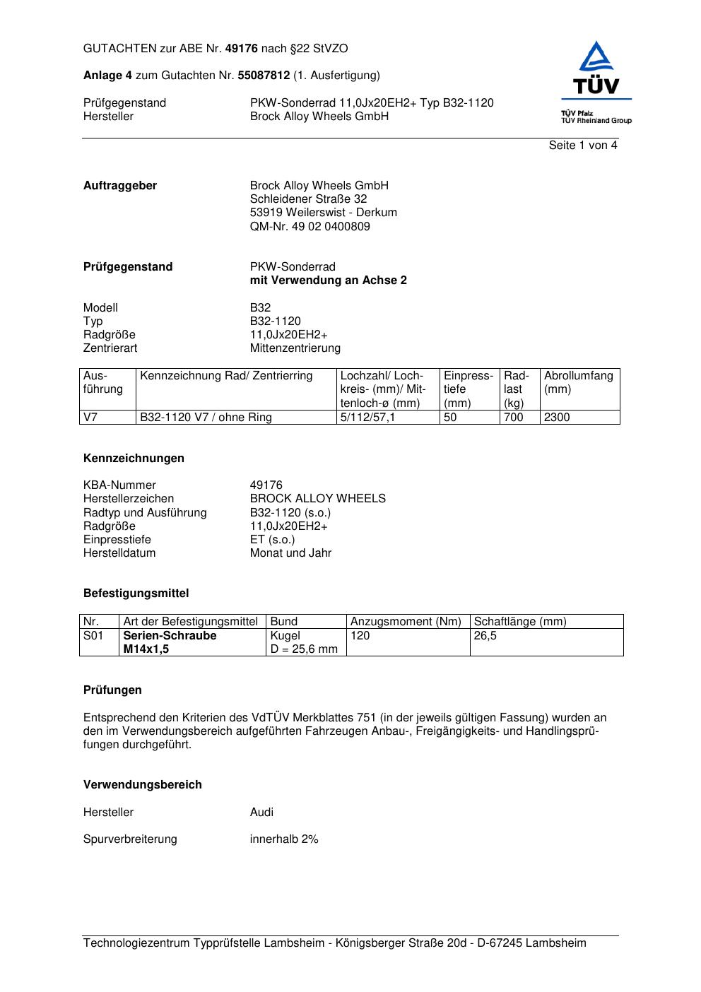 Felgengutachten / abe für Alufelgen Brock B32-1 120 (8.5Jx2 ET 0, Mittenloch 0 mm) mit KBA 49176 (Zertifikatsnummer 49176). Hier kostenlos als PDF herunterladen. Der Download-Link ist 24 Stunden gültig und kann bis zu zwei Mal verwendet werden.