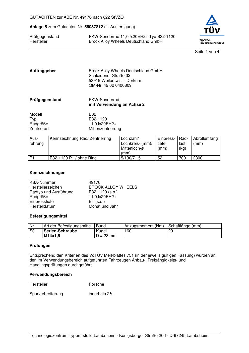 Felgengutachten / abe für Alufelgen Brock B32-1 120 (8.5Jx2 ET 0, Mittenloch 0 mm) mit KBA 49176 (Zertifikatsnummer 49176). Hier kostenlos als PDF herunterladen. Der Download-Link ist 24 Stunden gültig und kann bis zu zwei Mal verwendet werden.
