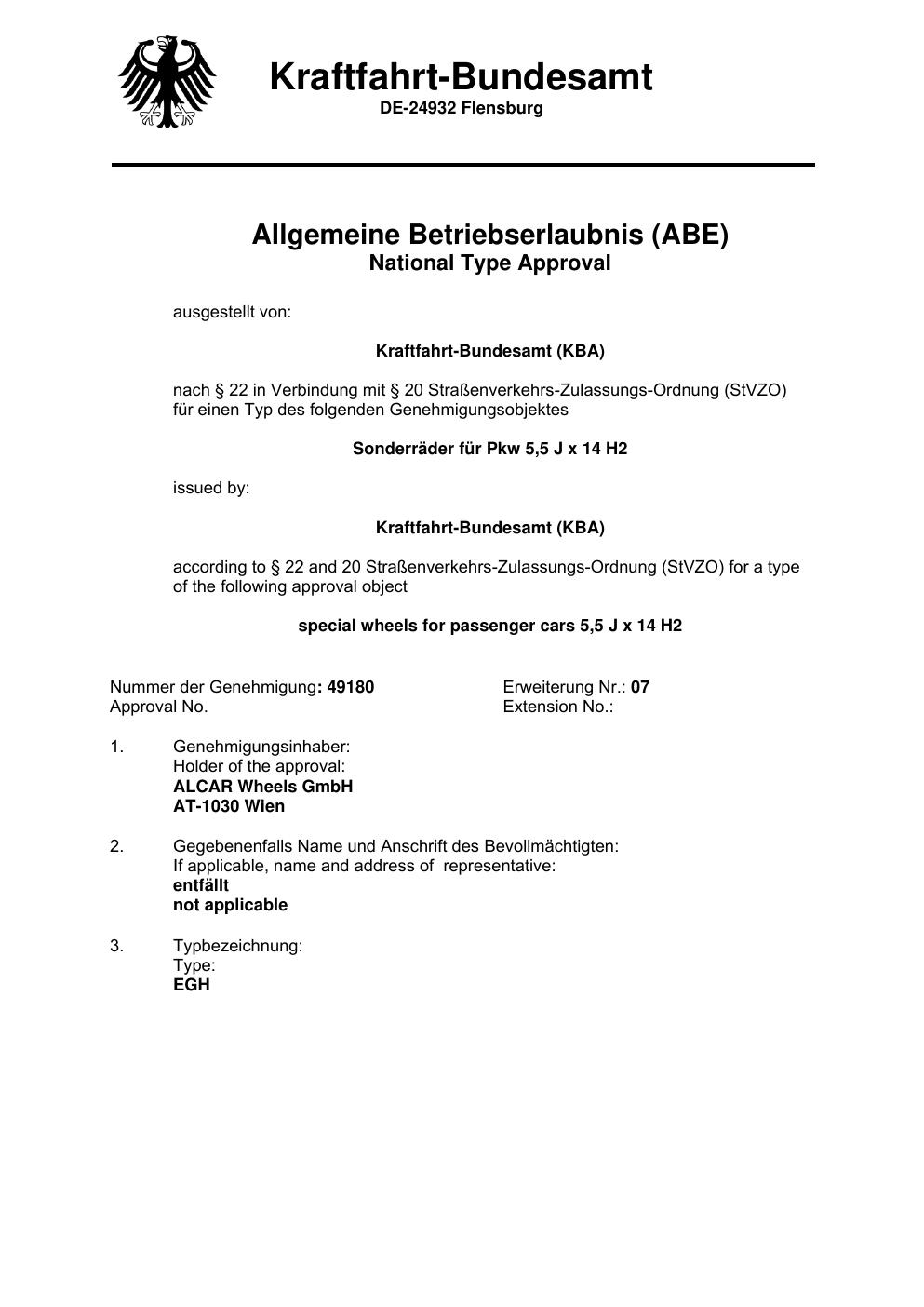 Dieses Gutachten (abe) bezieht sich auf die Alufelge ATS UN8080 in der Ausführung 5.5Jx14 ET 0, Mittenloch 0 mm (KBA 49180). Im PDF findest du typischerweise zulässige Reifengrößen, Auflagen/Anbauhinweise und – je nach Dokument – Hinweise zur Eintragung.