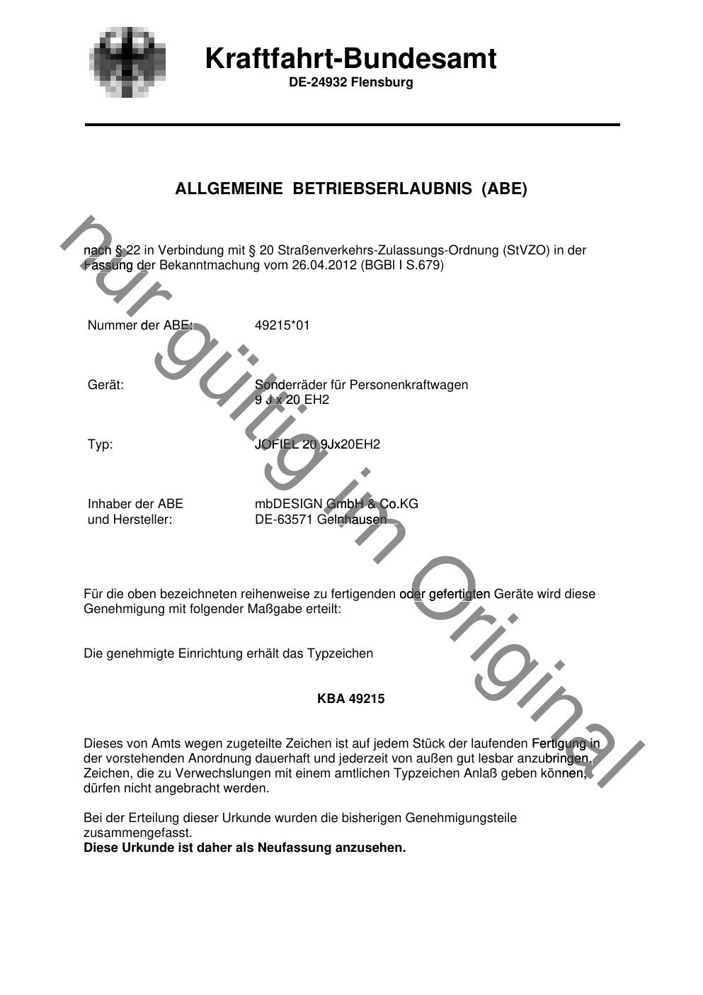 Dieses Gutachten (abe) bezieht sich auf die Alufelge ATS JOFIEL 20 9Jx20EH2 in der Ausführung 9Jx2 ET 0, Mittenloch 0 mm (KBA 49215). Im PDF findest du typischerweise zulässige Reifengrößen, Auflagen/Anbauhinweise und – je nach Dokument – Hinweise zur Eintragung.