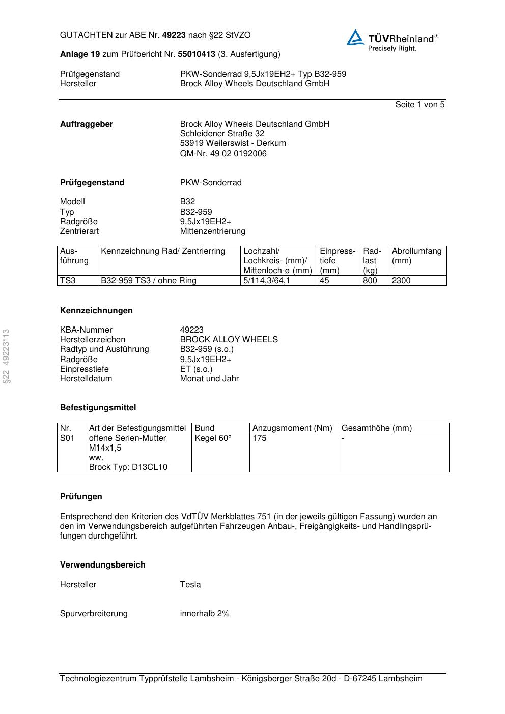 Dieses Gutachten (abe) bezieht sich auf die Alufelge Brock B32-95 9 in der Ausführung ET 0, Mittenloch 0 mm (KBA 49223). Im PDF findest du typischerweise zulässige Reifengrößen, Auflagen/Anbauhinweise und – je nach Dokument – Hinweise zur Eintragung.