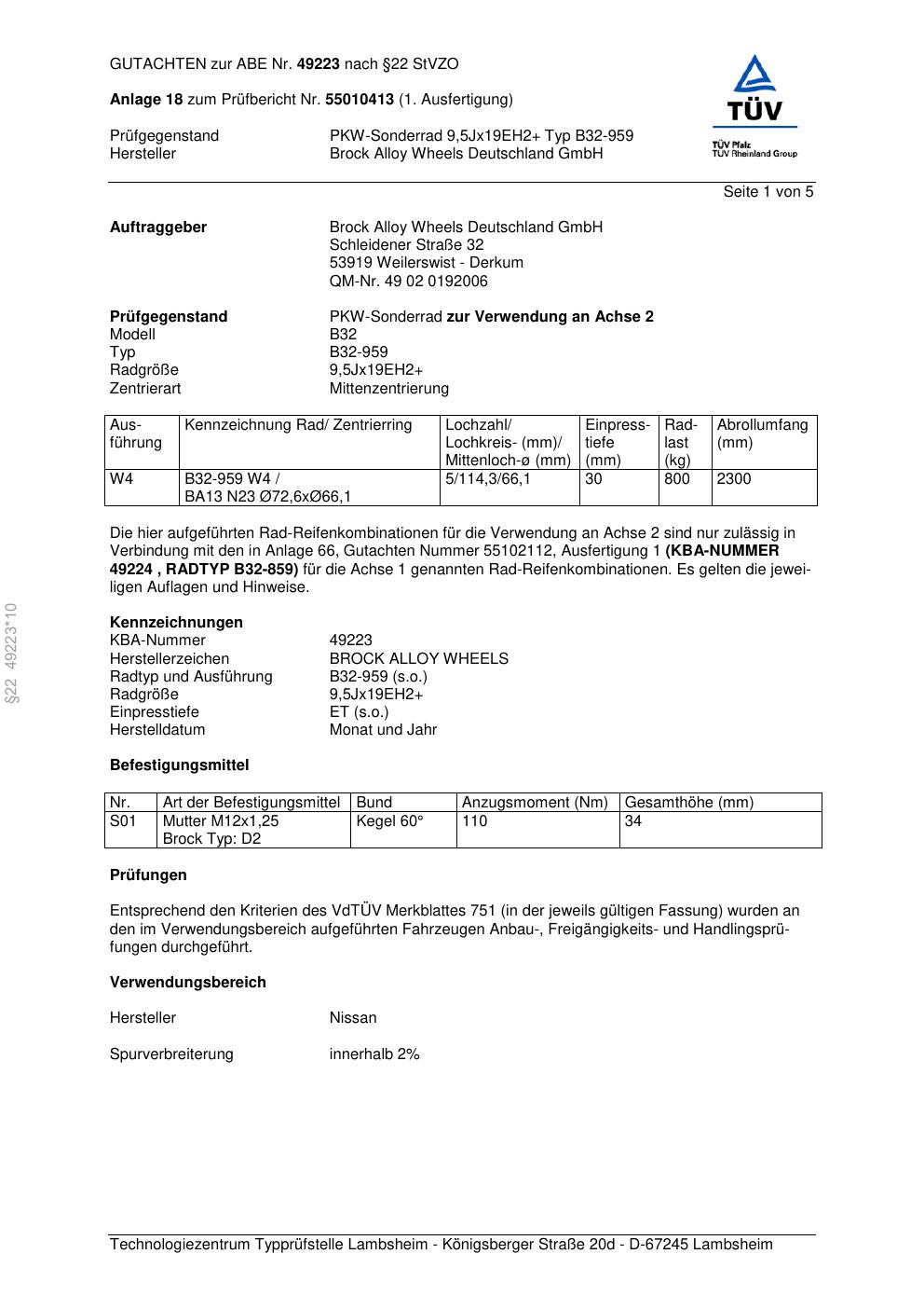 Dieses Gutachten (abe) bezieht sich auf die Alufelge Brock B32-95 9 in der Ausführung ET 0, Mittenloch 0 mm (KBA 49223). Im PDF findest du typischerweise zulässige Reifengrößen, Auflagen/Anbauhinweise und – je nach Dokument – Hinweise zur Eintragung.