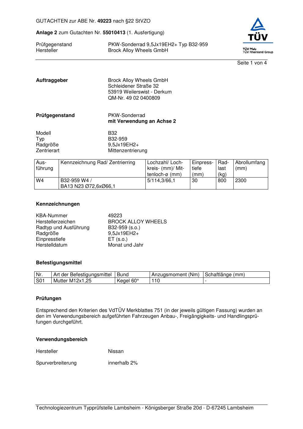 Dieses Gutachten (abe) bezieht sich auf die Alufelge Brock B32-95 9 in der Ausführung 8.5Jx19 ET 0, Mittenloch 0 mm (KBA 49223). Im PDF findest du typischerweise zulässige Reifengrößen, Auflagen/Anbauhinweise und – je nach Dokument – Hinweise zur Eintragung.