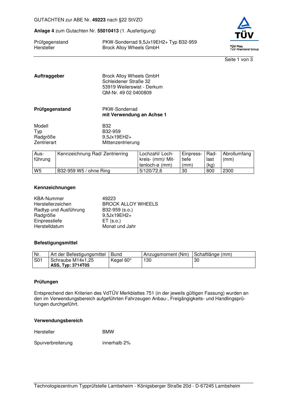 Dieses Gutachten (abe) bezieht sich auf die Alufelge Brock B32-95 9 in der Ausführung 9.5Jx19 ET 0, Mittenloch 0 mm (KBA 49223). Im PDF findest du typischerweise zulässige Reifengrößen, Auflagen/Anbauhinweise und – je nach Dokument – Hinweise zur Eintragung.