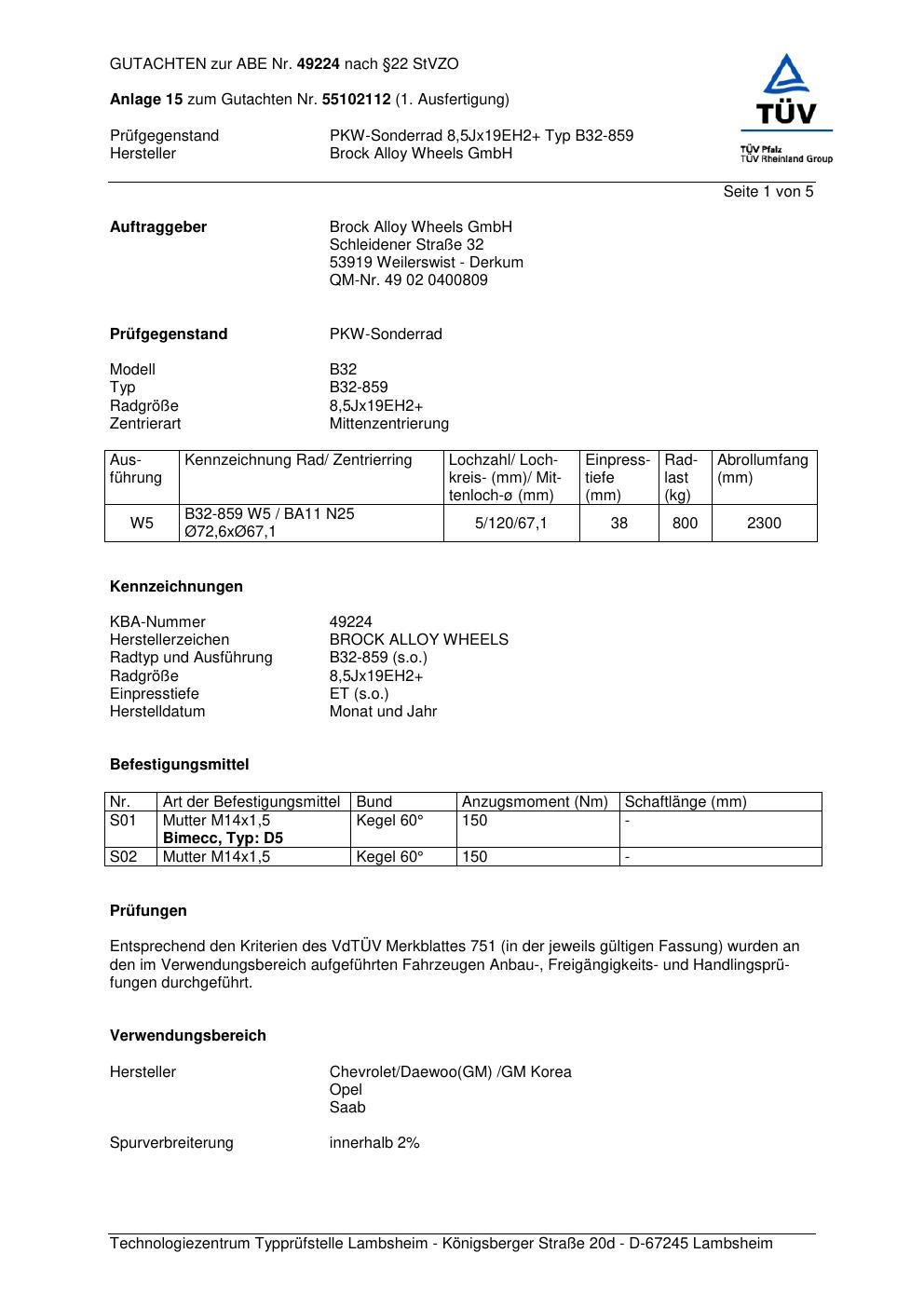Dieses Gutachten (abe) bezieht sich auf die Alufelge Brock B32-85 9 in der Ausführung ET 0, Mittenloch 0 mm (KBA 49224). Im PDF findest du typischerweise zulässige Reifengrößen, Auflagen/Anbauhinweise und – je nach Dokument – Hinweise zur Eintragung.