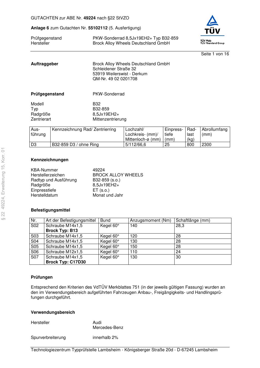 Dieses Gutachten (abe) bezieht sich auf die Alufelge Brock B32-85 9 in der Ausführung ET 0, Mittenloch 0 mm (KBA 49224). Im PDF findest du typischerweise zulässige Reifengrößen, Auflagen/Anbauhinweise und – je nach Dokument – Hinweise zur Eintragung.