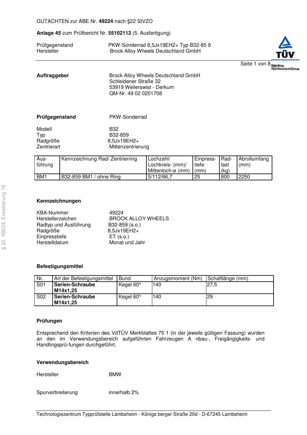 Dieses Gutachten (abe) bezieht sich auf die Alufelge Brock B32-85 9 in der Ausführung ET 0, Mittenloch 0 mm (KBA 49224). Im PDF findest du typischerweise zulässige Reifengrößen, Auflagen/Anbauhinweise und – je nach Dokument – Hinweise zur Eintragung.