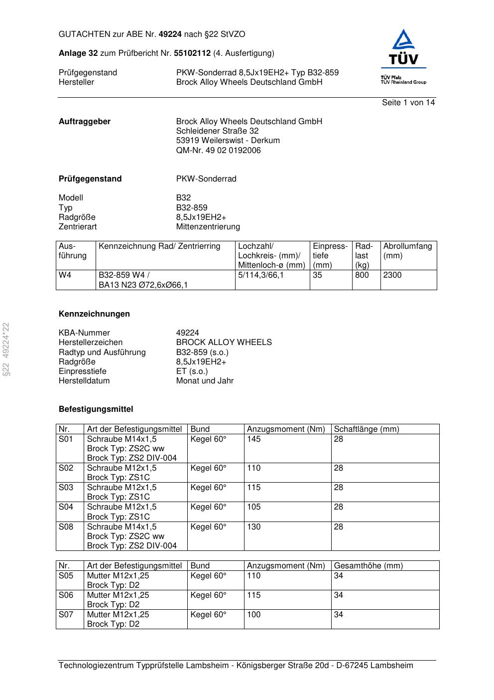 Dieses Gutachten (abe) bezieht sich auf die Alufelge Brock B32-85 9 in der Ausführung ET 0, Mittenloch 0 mm (KBA 49224). Im PDF findest du typischerweise zulässige Reifengrößen, Auflagen/Anbauhinweise und – je nach Dokument – Hinweise zur Eintragung.