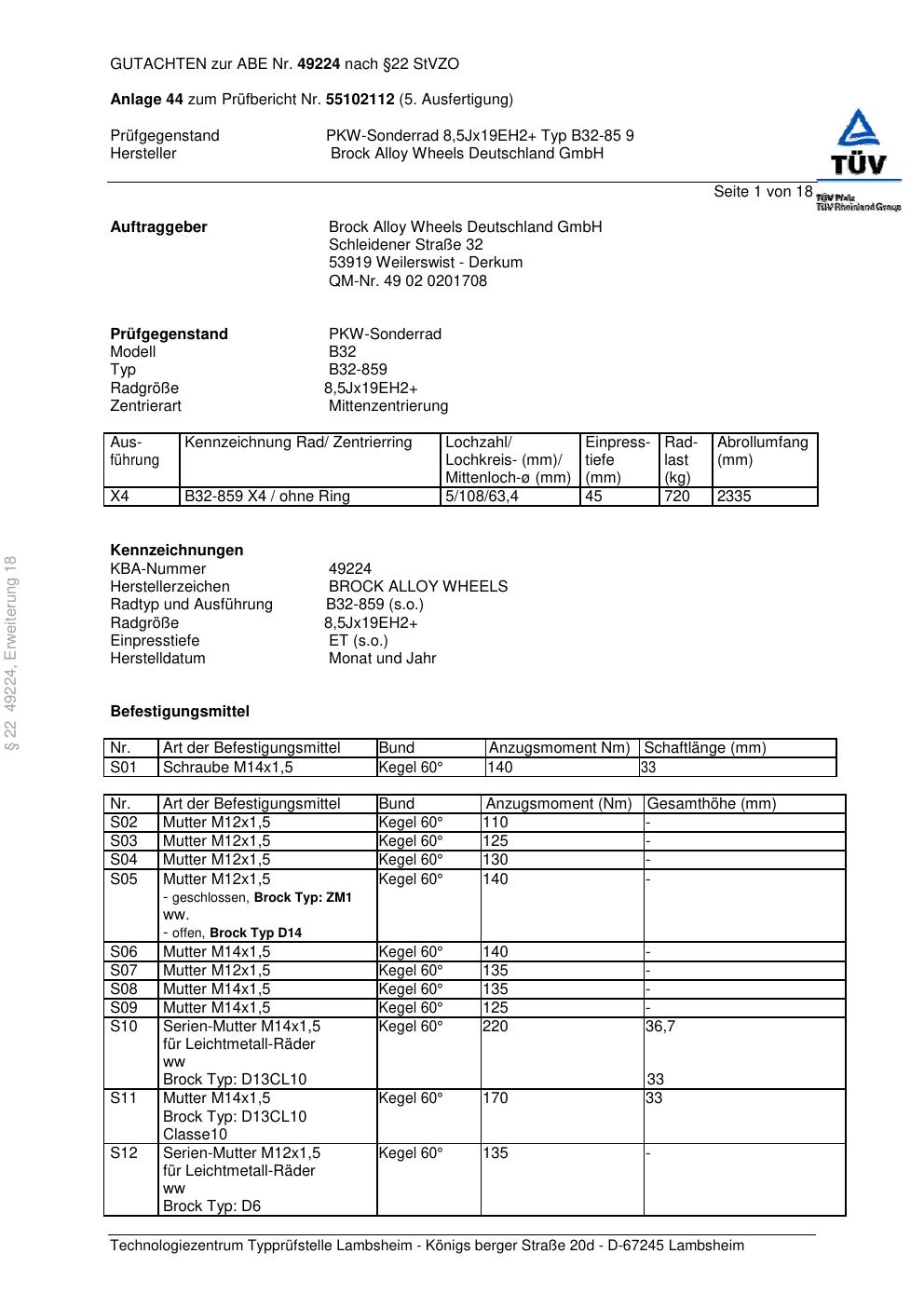 Dieses Gutachten (abe) bezieht sich auf die Alufelge Brock B32-85 9 in der Ausführung 18Jx98 ET 0, Mittenloch 0 mm (KBA 49224). Im PDF findest du typischerweise zulässige Reifengrößen, Auflagen/Anbauhinweise und – je nach Dokument – Hinweise zur Eintragung.