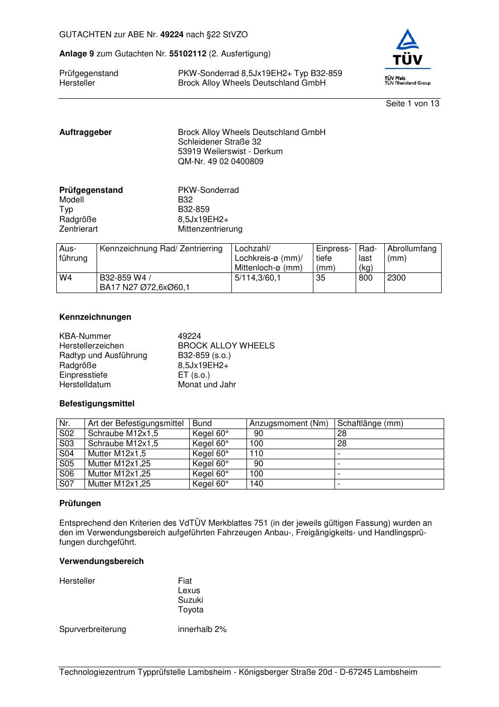 Dieses Gutachten (abe) bezieht sich auf die Alufelge Brock B32-85 9 in der Ausführung 8.5Jx19 ET 0, Mittenloch 0 mm (KBA 49224). Im PDF findest du typischerweise zulässige Reifengrößen, Auflagen/Anbauhinweise und – je nach Dokument – Hinweise zur Eintragung.