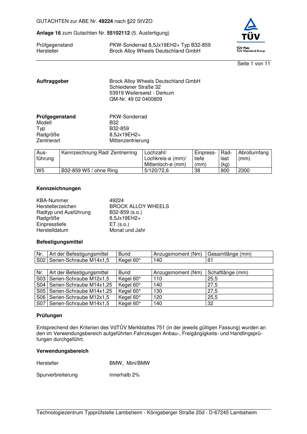 Dieses Gutachten (abe) bezieht sich auf die Alufelge Brock B32-85 9 in der Ausführung 8.5Jx19 ET 0, Mittenloch 0 mm (KBA 49224). Im PDF findest du typischerweise zulässige Reifengrößen, Auflagen/Anbauhinweise und – je nach Dokument – Hinweise zur Eintragung.
