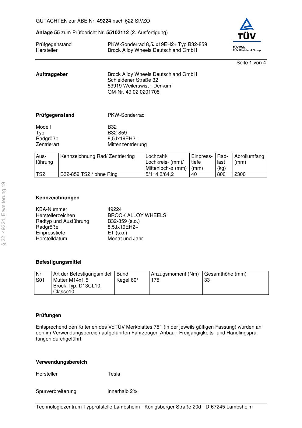 Dieses Gutachten (abe) bezieht sich auf die Alufelge Brock B32-85 9 in der Ausführung ET 0, Mittenloch 0 mm (KBA 49224). Im PDF findest du typischerweise zulässige Reifengrößen, Auflagen/Anbauhinweise und – je nach Dokument – Hinweise zur Eintragung.