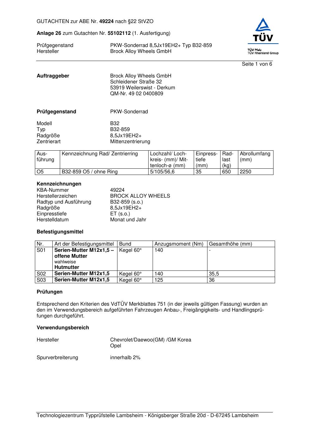 Dieses Gutachten (abe) bezieht sich auf die Alufelge Brock B32-85 9 in der Ausführung ET 0, Mittenloch 0 mm (KBA 49224). Im PDF findest du typischerweise zulässige Reifengrößen, Auflagen/Anbauhinweise und – je nach Dokument – Hinweise zur Eintragung.