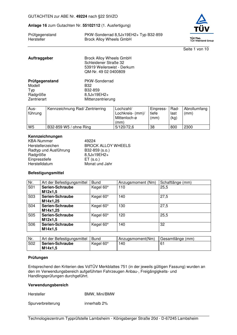 Dieses Gutachten (abe) bezieht sich auf die Alufelge Brock B32-85 9 in der Ausführung ET 0, Mittenloch 0 mm (KBA 49224). Im PDF findest du typischerweise zulässige Reifengrößen, Auflagen/Anbauhinweise und – je nach Dokument – Hinweise zur Eintragung.
