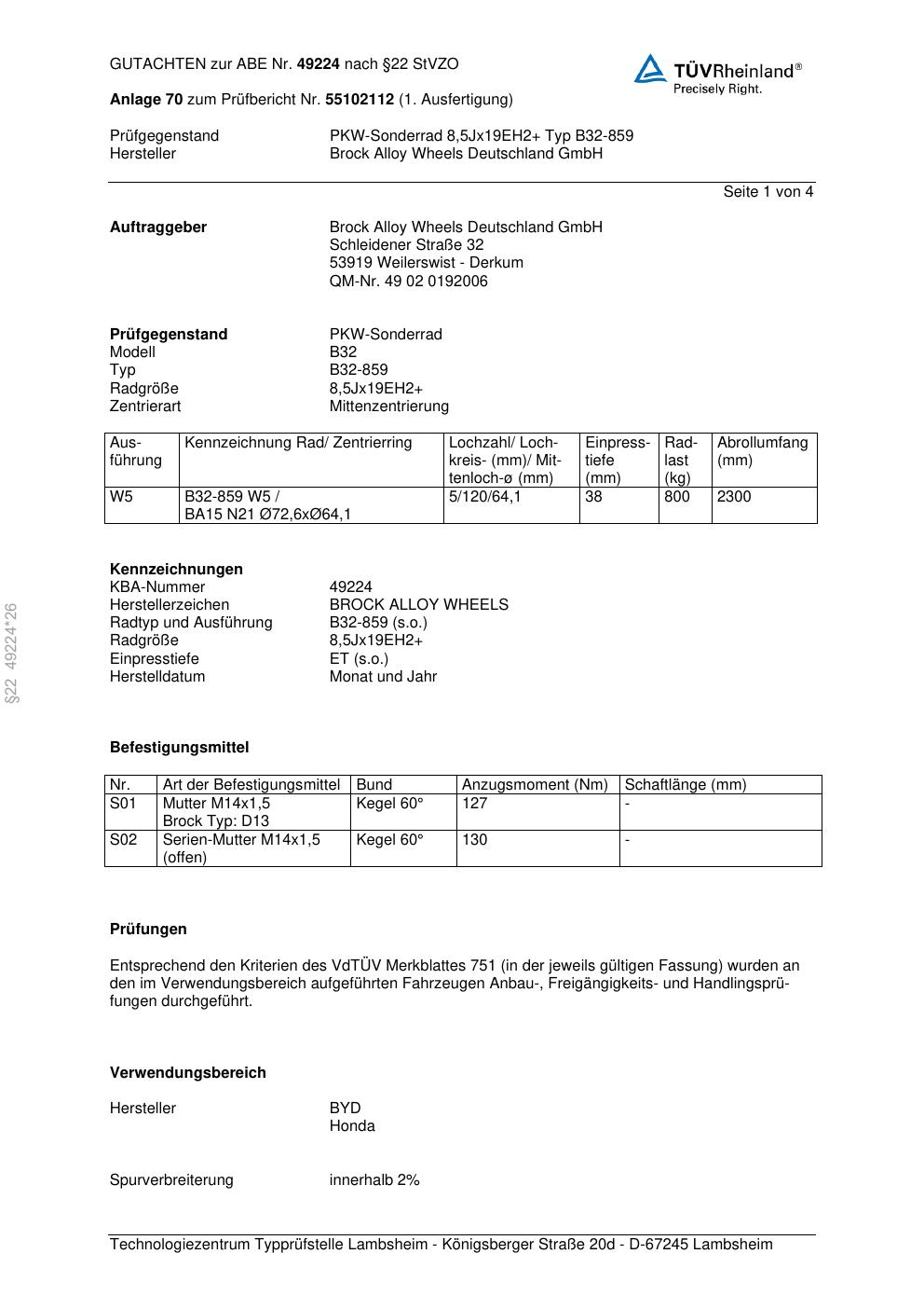 Dieses Gutachten (abe) bezieht sich auf die Alufelge Brock B32-85 9 in der Ausführung ET 0, Mittenloch 0 mm (KBA 49224). Im PDF findest du typischerweise zulässige Reifengrößen, Auflagen/Anbauhinweise und – je nach Dokument – Hinweise zur Eintragung.