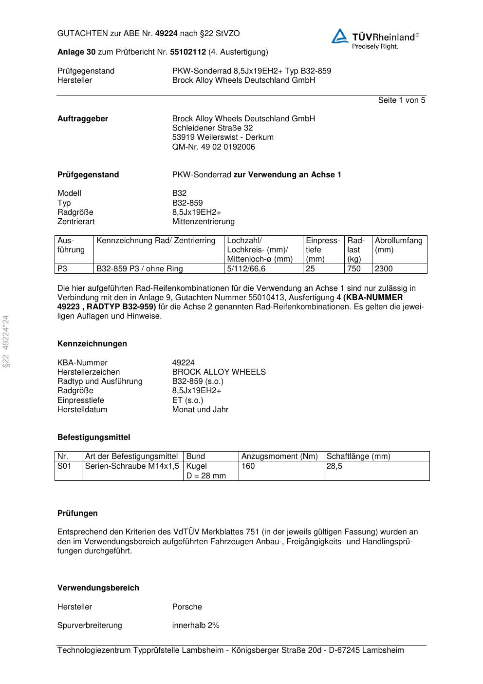 Dieses Gutachten (abe) bezieht sich auf die Alufelge Brock B32-85 9 in der Ausführung ET 0, Mittenloch 0 mm (KBA 49224). Im PDF findest du typischerweise zulässige Reifengrößen, Auflagen/Anbauhinweise und – je nach Dokument – Hinweise zur Eintragung.
