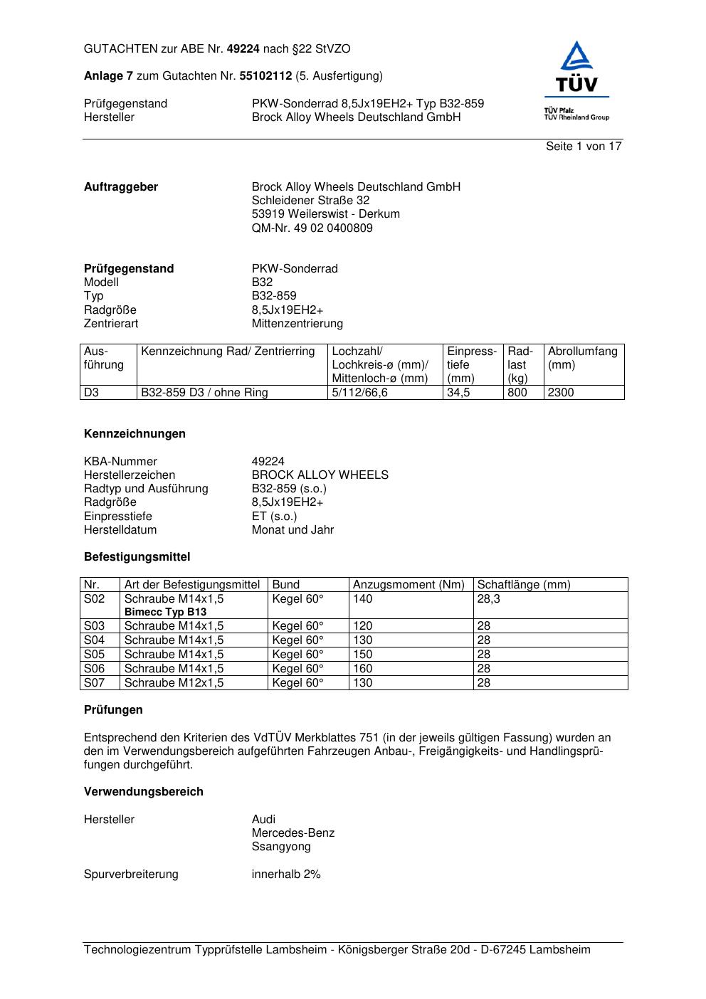 Dieses Gutachten (abe) bezieht sich auf die Alufelge Brock B32-85 9 in der Ausführung 8.5Jx19 ET 0, Mittenloch 0 mm (KBA 49224). Im PDF findest du typischerweise zulässige Reifengrößen, Auflagen/Anbauhinweise und – je nach Dokument – Hinweise zur Eintragung.