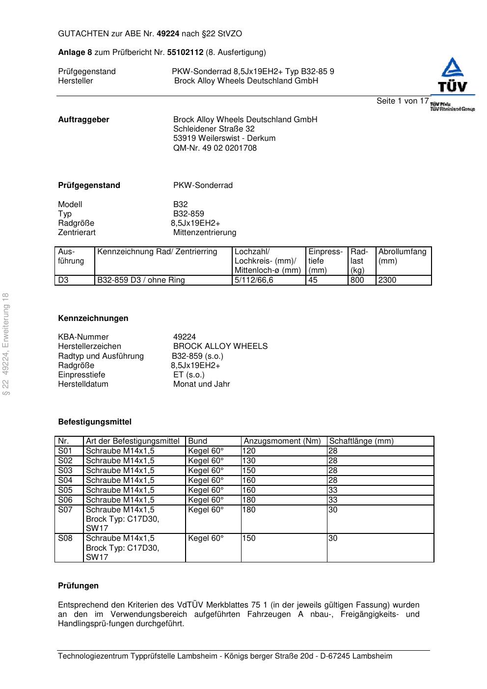 Dieses Gutachten (abe) bezieht sich auf die Alufelge Brock B32-85 9 in der Ausführung ET 0, Mittenloch 0 mm (KBA 49224). Im PDF findest du typischerweise zulässige Reifengrößen, Auflagen/Anbauhinweise und – je nach Dokument – Hinweise zur Eintragung.