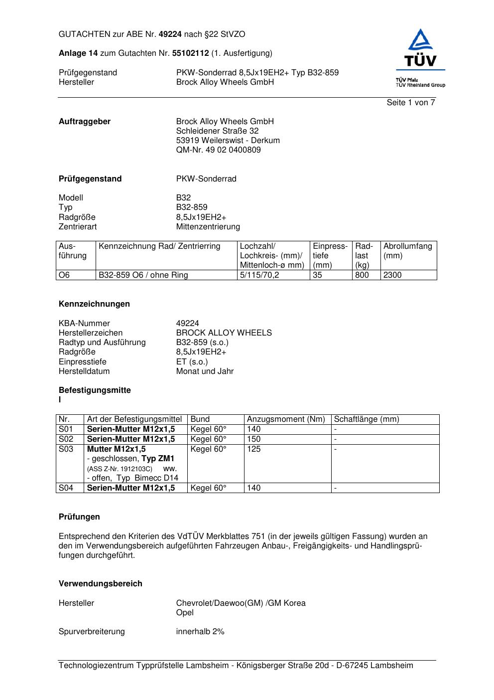 Dieses Gutachten (abe) bezieht sich auf die Alufelge Brock B32-85 9 in der Ausführung ET 0, Mittenloch 0 mm (KBA 49224). Im PDF findest du typischerweise zulässige Reifengrößen, Auflagen/Anbauhinweise und – je nach Dokument – Hinweise zur Eintragung.