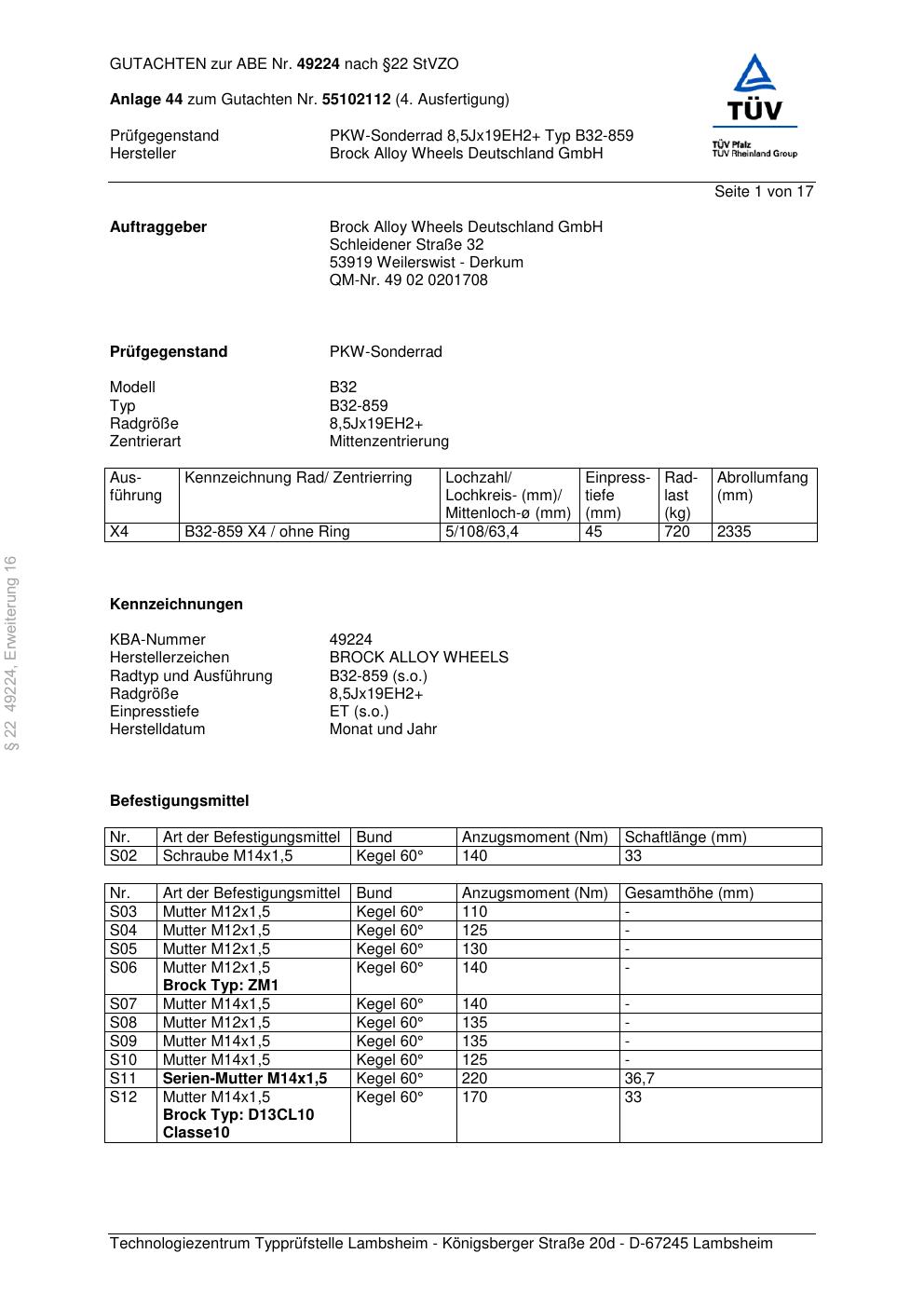 Dieses Gutachten (abe) bezieht sich auf die Alufelge Brock B32-85 9 in der Ausführung ET 0, Mittenloch 0 mm (KBA 49224). Im PDF findest du typischerweise zulässige Reifengrößen, Auflagen/Anbauhinweise und – je nach Dokument – Hinweise zur Eintragung.