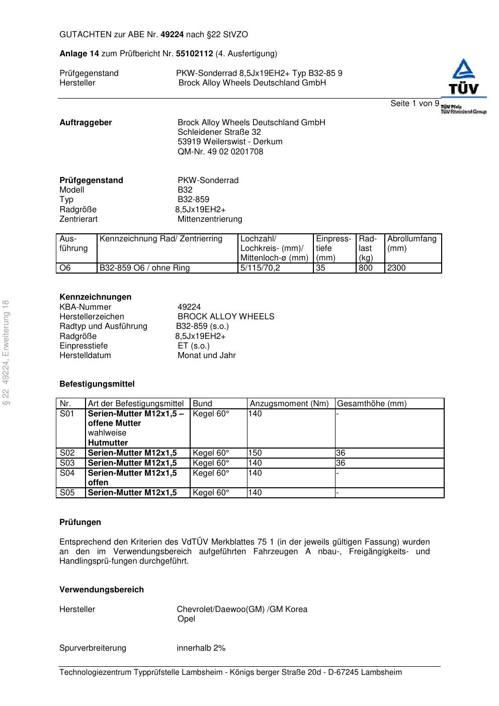 Dieses Gutachten (abe) bezieht sich auf die Alufelge Brock B32-85 9 in der Ausführung ET 0, Mittenloch 0 mm (KBA 49224). Im PDF findest du typischerweise zulässige Reifengrößen, Auflagen/Anbauhinweise und – je nach Dokument – Hinweise zur Eintragung.