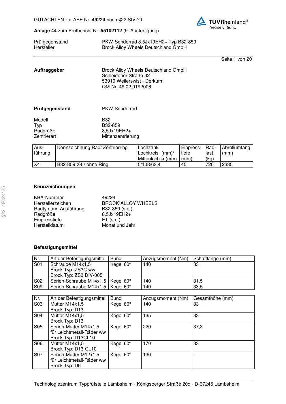 Dieses Gutachten (abe) bezieht sich auf die Alufelge Brock B32-85 9 in der Ausführung 8.5Jx21 ET 0, Mittenloch 0 mm (KBA 49224). Im PDF findest du typischerweise zulässige Reifengrößen, Auflagen/Anbauhinweise und – je nach Dokument – Hinweise zur Eintragung.