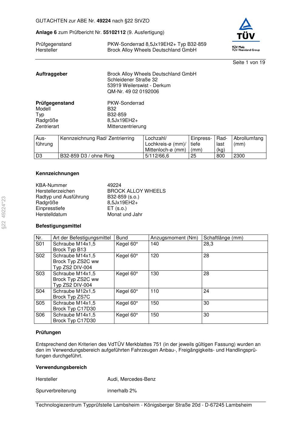 Dieses Gutachten (abe) bezieht sich auf die Alufelge Brock B32-85 9 in der Ausführung ET 0, Mittenloch 0 mm (KBA 49224). Im PDF findest du typischerweise zulässige Reifengrößen, Auflagen/Anbauhinweise und – je nach Dokument – Hinweise zur Eintragung.