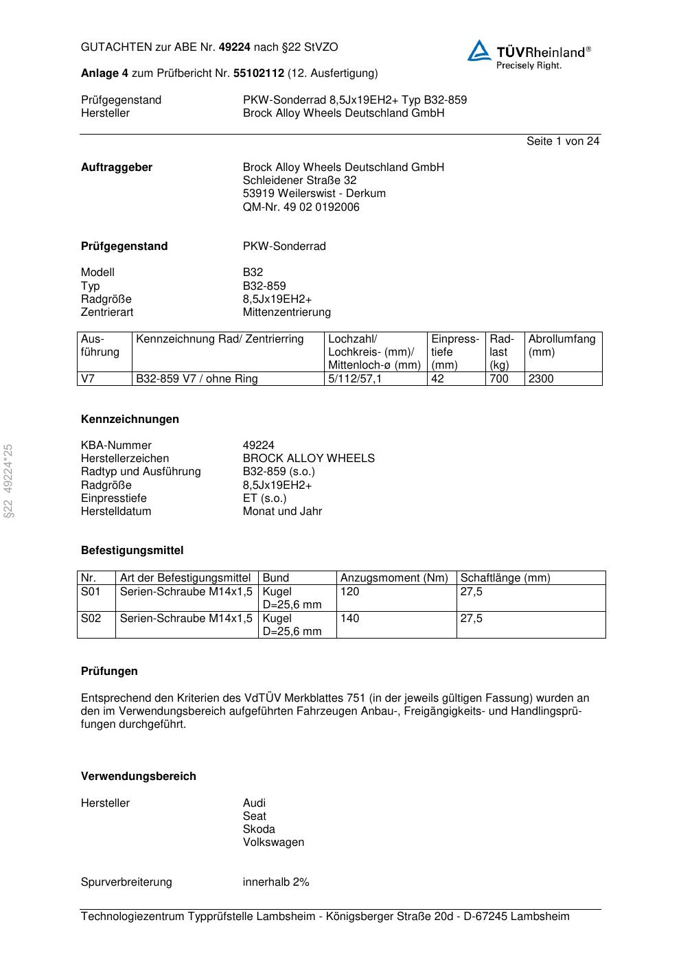Dieses Gutachten (abe) bezieht sich auf die Alufelge Brock B32-85 9 in der Ausführung ET 0, Mittenloch 0 mm (KBA 49224). Im PDF findest du typischerweise zulässige Reifengrößen, Auflagen/Anbauhinweise und – je nach Dokument – Hinweise zur Eintragung.