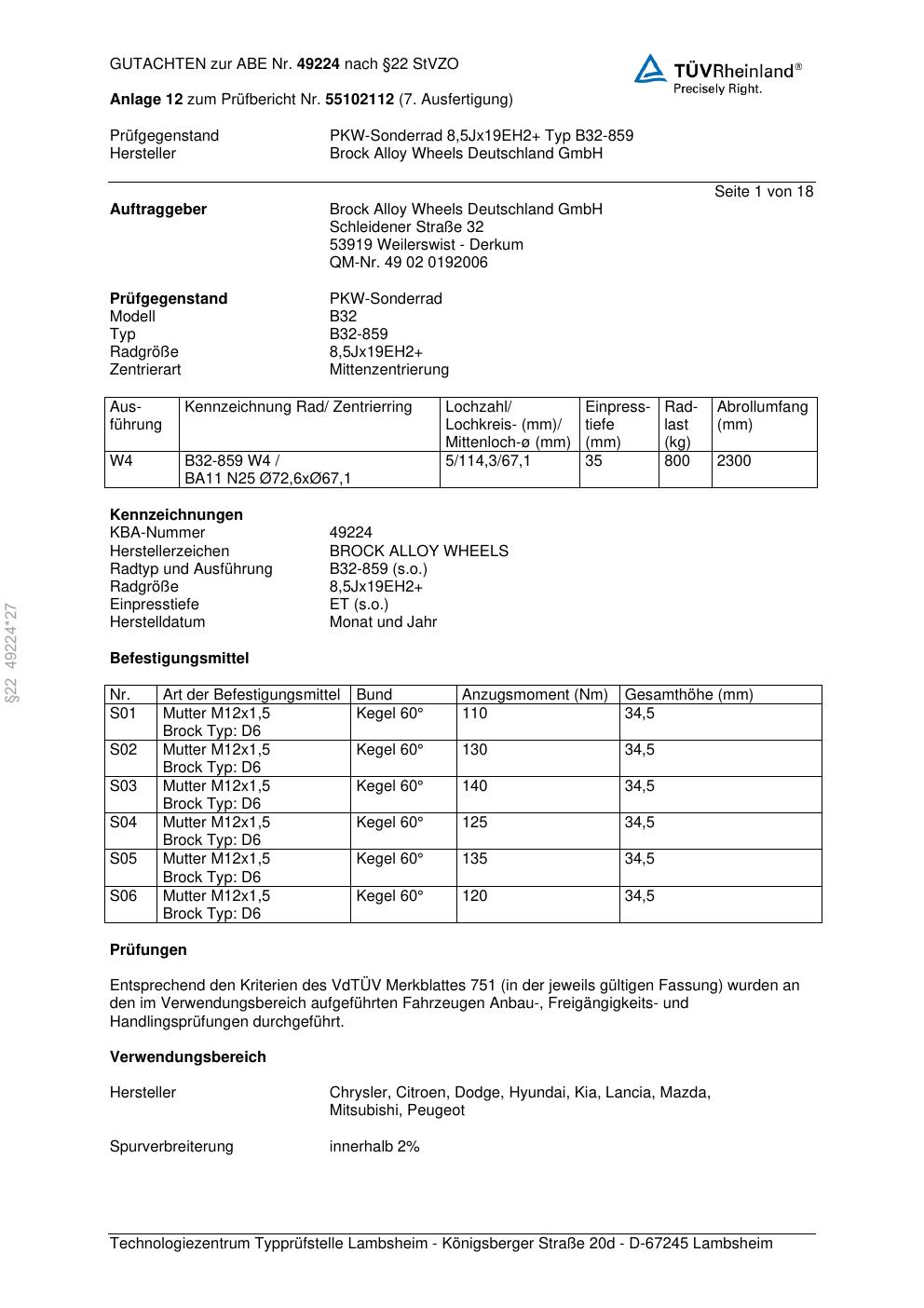 Dieses Gutachten (abe) bezieht sich auf die Alufelge Brock B32-85 9 in der Ausführung ET 0, Mittenloch 0 mm (KBA 49224). Im PDF findest du typischerweise zulässige Reifengrößen, Auflagen/Anbauhinweise und – je nach Dokument – Hinweise zur Eintragung.