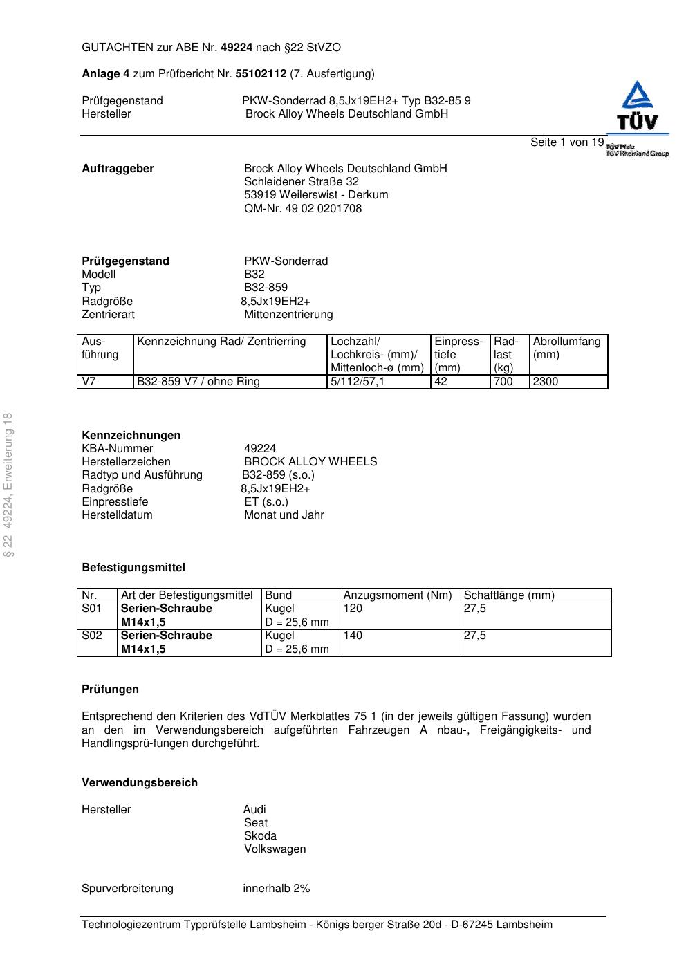 Dieses Gutachten (abe) bezieht sich auf die Alufelge Brock B32-85 9 in der Ausführung ET 0, Mittenloch 0 mm (KBA 49224). Im PDF findest du typischerweise zulässige Reifengrößen, Auflagen/Anbauhinweise und – je nach Dokument – Hinweise zur Eintragung.