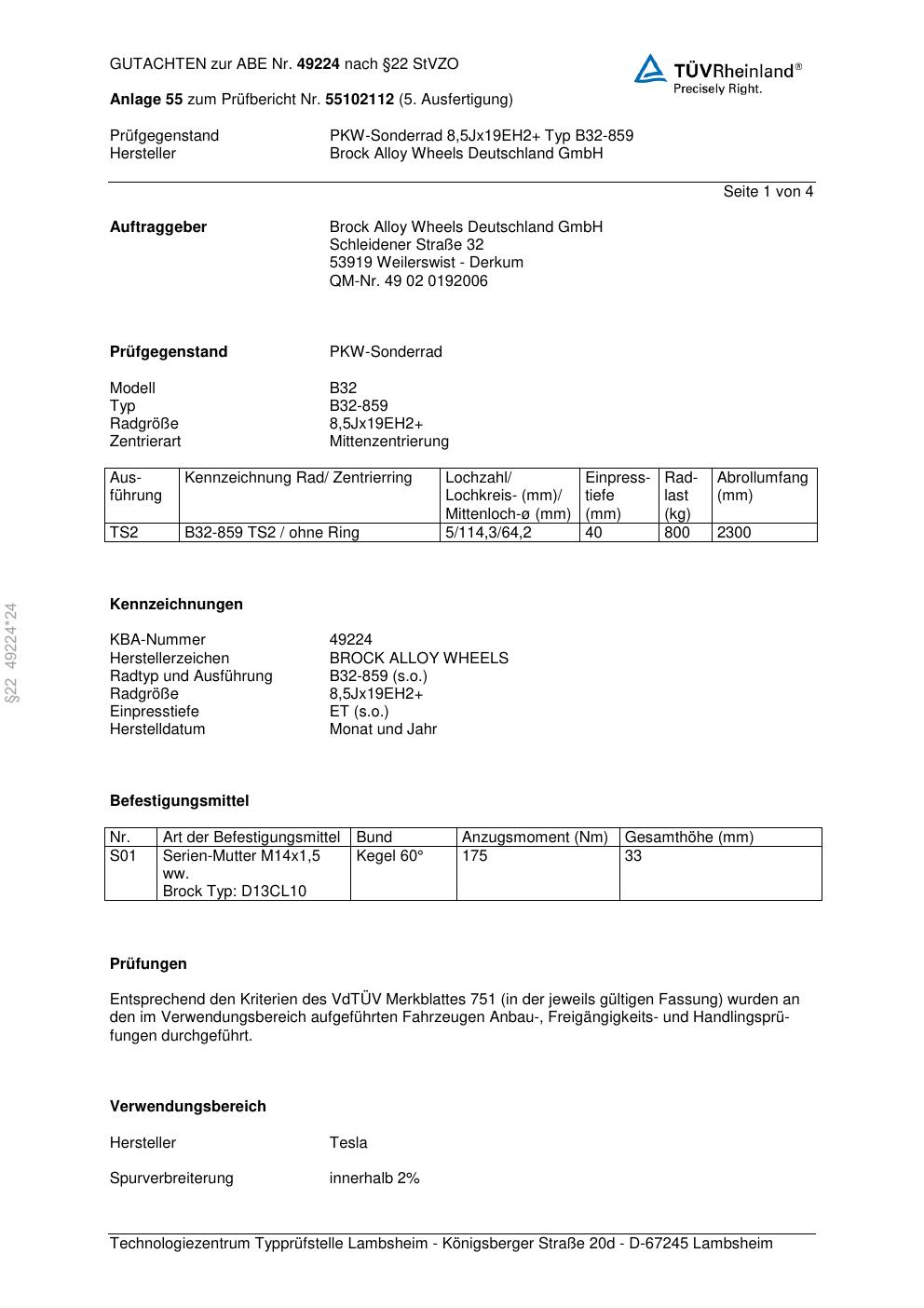 Dieses Gutachten (abe) bezieht sich auf die Alufelge Brock B32-85 9 in der Ausführung ET 0, Mittenloch 0 mm (KBA 49224). Im PDF findest du typischerweise zulässige Reifengrößen, Auflagen/Anbauhinweise und – je nach Dokument – Hinweise zur Eintragung.