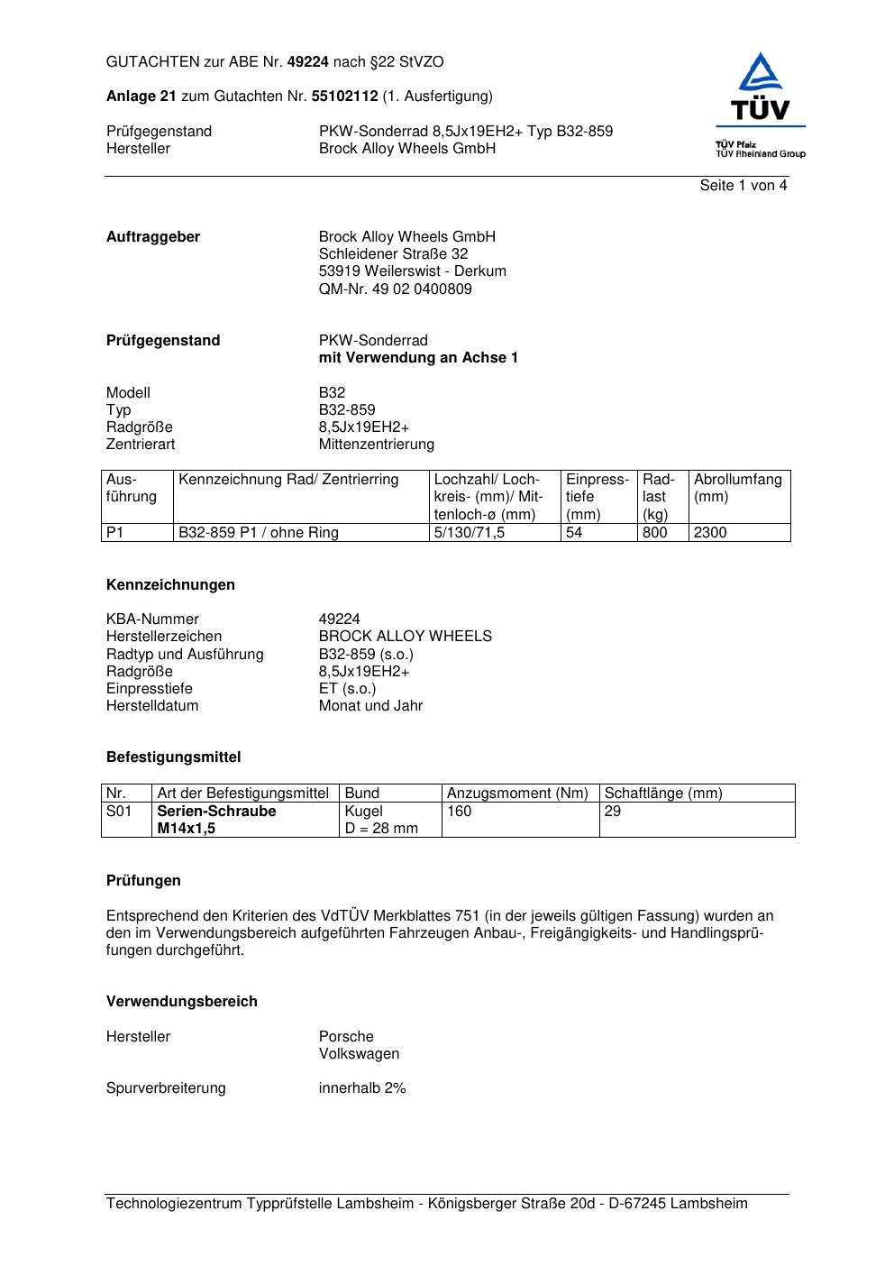Felgengutachten / abe für Alufelgen Brock B32-85 9 (11Jx19 ET 0, Mittenloch 0 mm) mit KBA 49224 (Zertifikatsnummer 49224). Hier kostenlos als PDF herunterladen. Der Download-Link ist 24 Stunden gültig und kann bis zu zwei Mal verwendet werden.