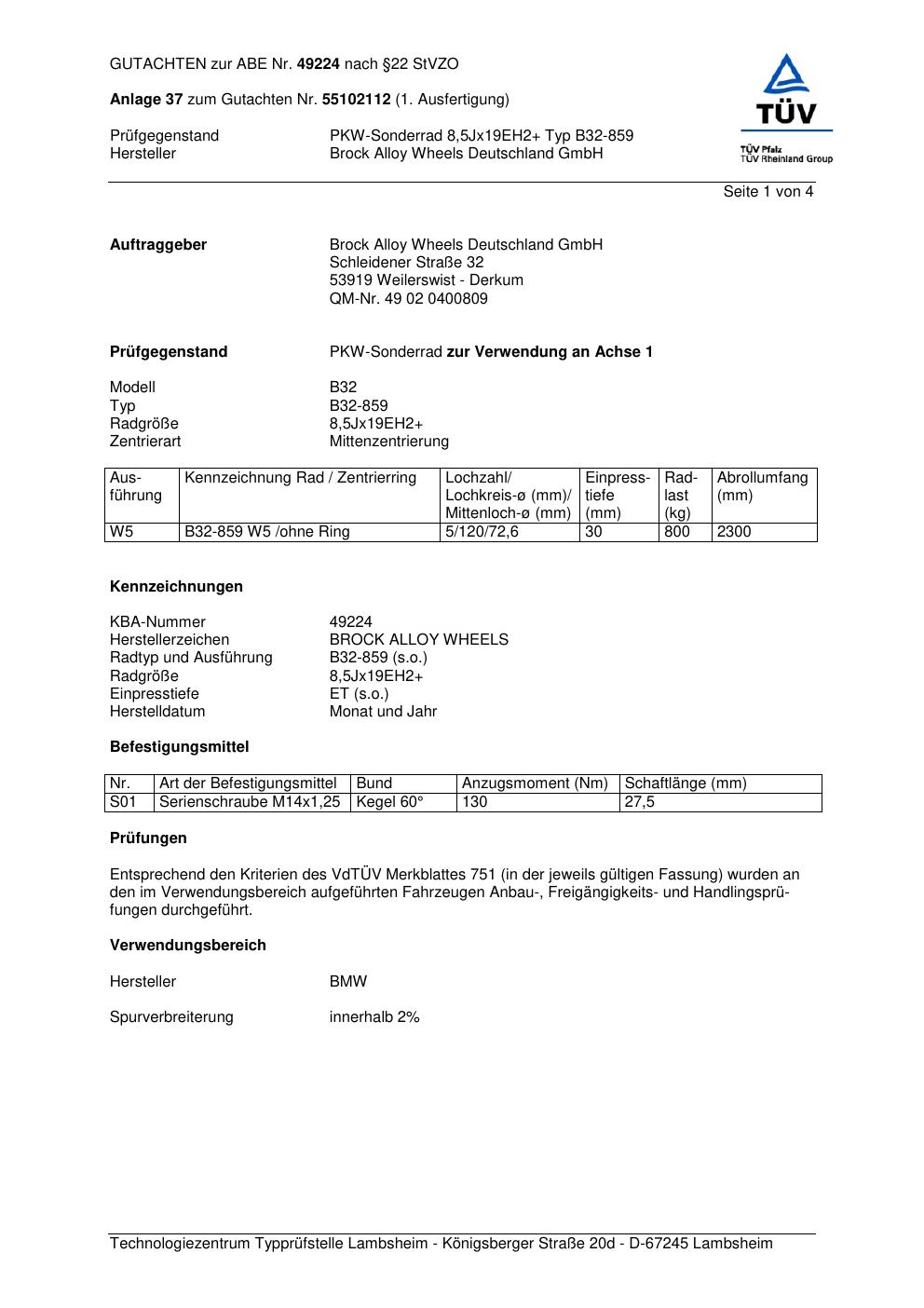Dieses Gutachten (abe) bezieht sich auf die Alufelge Brock B32-85 9 in der Ausführung 8.5Jx19 ET 0, Mittenloch 0 mm (KBA 49224). Im PDF findest du typischerweise zulässige Reifengrößen, Auflagen/Anbauhinweise und – je nach Dokument – Hinweise zur Eintragung.