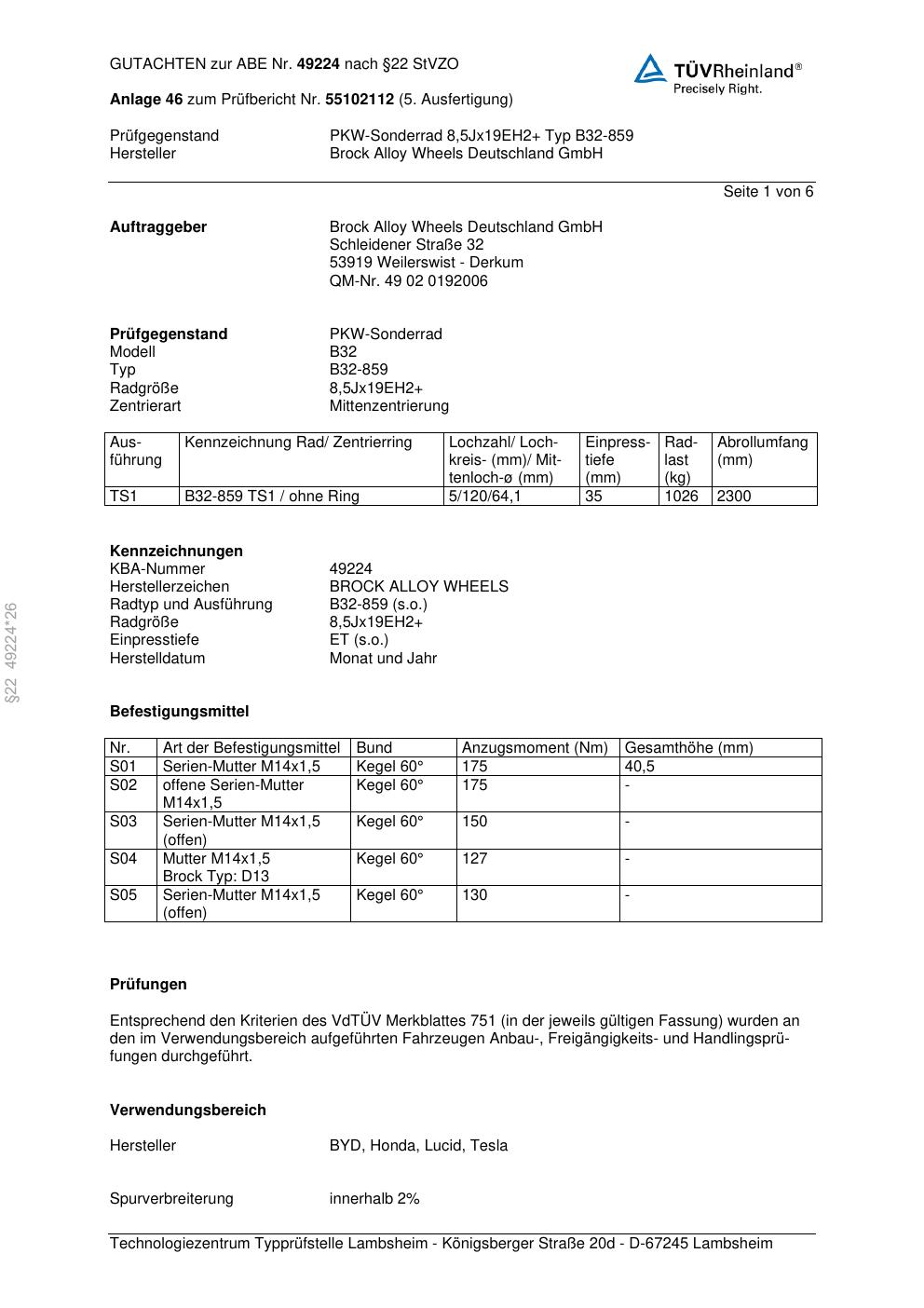 Dieses Gutachten (abe) bezieht sich auf die Alufelge Brock B32-85 9 in der Ausführung ET 0, Mittenloch 0 mm (KBA 49224). Im PDF findest du typischerweise zulässige Reifengrößen, Auflagen/Anbauhinweise und – je nach Dokument – Hinweise zur Eintragung.