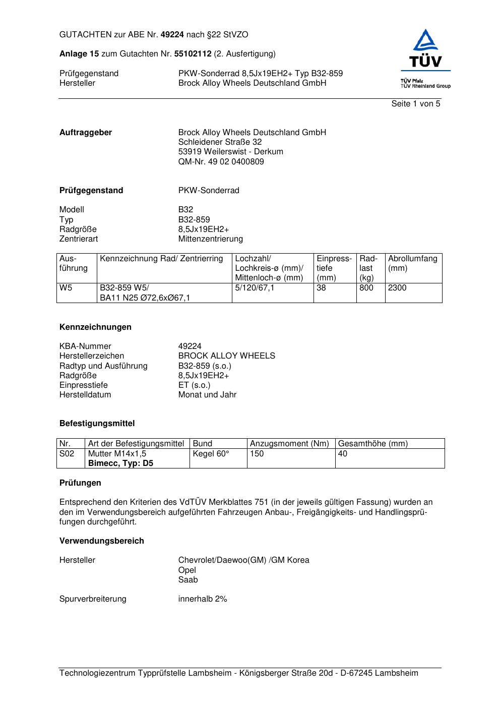 Dieses Gutachten (abe) bezieht sich auf die Alufelge Brock B32-85 9 in der Ausführung 8.5Jx19 ET 0, Mittenloch 0 mm (KBA 49224). Im PDF findest du typischerweise zulässige Reifengrößen, Auflagen/Anbauhinweise und – je nach Dokument – Hinweise zur Eintragung.