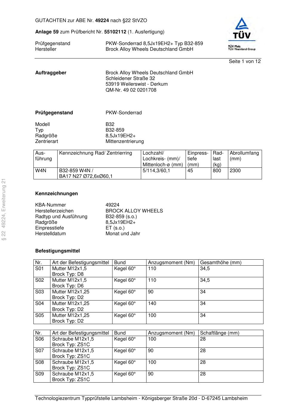 Dieses Gutachten (abe) bezieht sich auf die Alufelge Brock B32-859 in der Ausführung ET 0, Mittenloch 0 mm (KBA 49224). Im PDF findest du typischerweise zulässige Reifengrößen, Auflagen/Anbauhinweise und – je nach Dokument – Hinweise zur Eintragung.