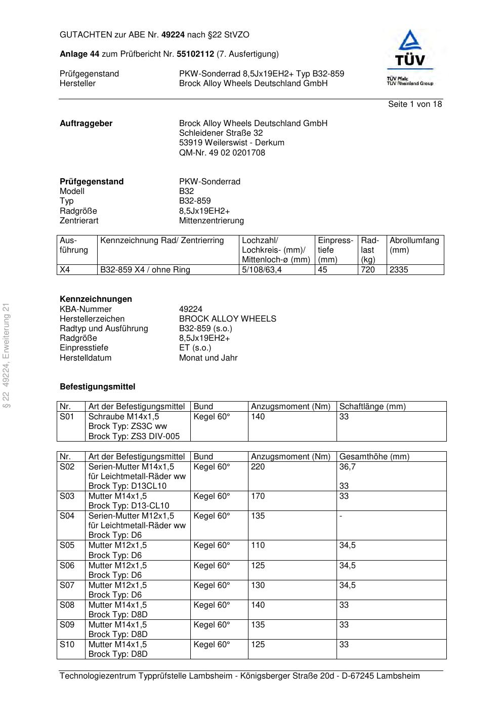 Dieses Gutachten (abe) bezieht sich auf die Alufelge Brock B32-859 in der Ausführung 8.5Jx21 ET 0, Mittenloch 0 mm (KBA 49224). Im PDF findest du typischerweise zulässige Reifengrößen, Auflagen/Anbauhinweise und – je nach Dokument – Hinweise zur Eintragung.