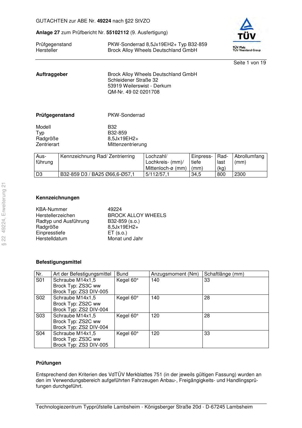 Dieses Gutachten (abe) bezieht sich auf die Alufelge Brock B32-859 in der Ausführung 8.5Jx19 ET 0, Mittenloch 0 mm (KBA 49224). Im PDF findest du typischerweise zulässige Reifengrößen, Auflagen/Anbauhinweise und – je nach Dokument – Hinweise zur Eintragung.