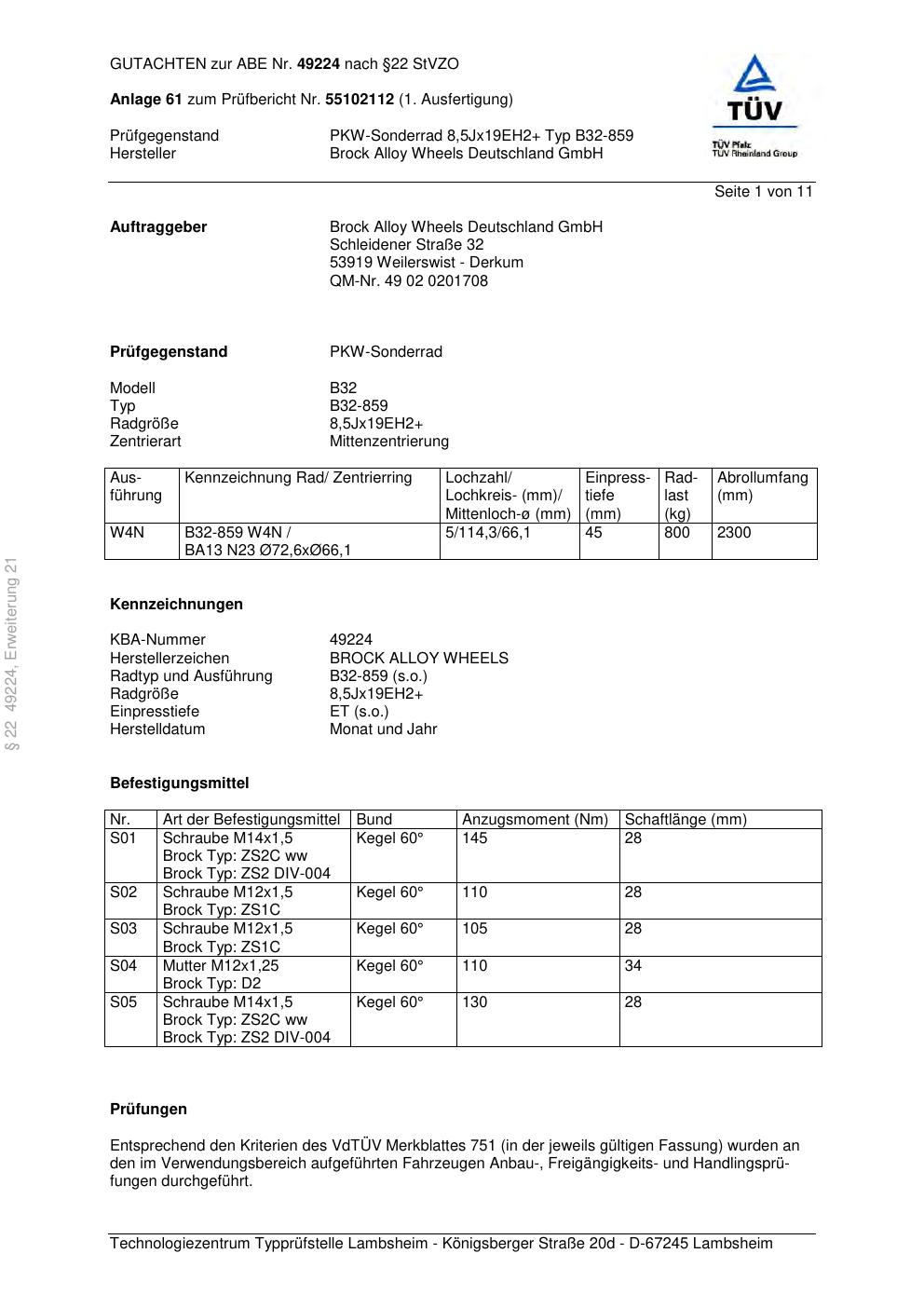 Dieses Gutachten (abe) bezieht sich auf die Alufelge Brock B32-859 in der Ausführung ET 0, Mittenloch 0 mm (KBA 49224). Im PDF findest du typischerweise zulässige Reifengrößen, Auflagen/Anbauhinweise und – je nach Dokument – Hinweise zur Eintragung.