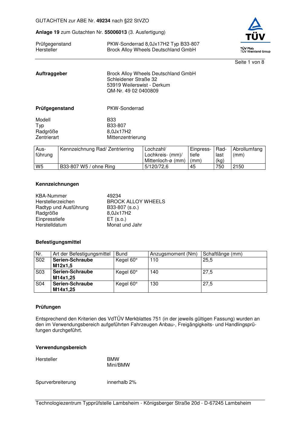Dieses Gutachten (abe) bezieht sich auf die Alufelge Brock B33-807 in der Ausführung 8Jx17 ET 0, Mittenloch 0 mm (KBA 49234). Im PDF findest du typischerweise zulässige Reifengrößen, Auflagen/Anbauhinweise und – je nach Dokument – Hinweise zur Eintragung.