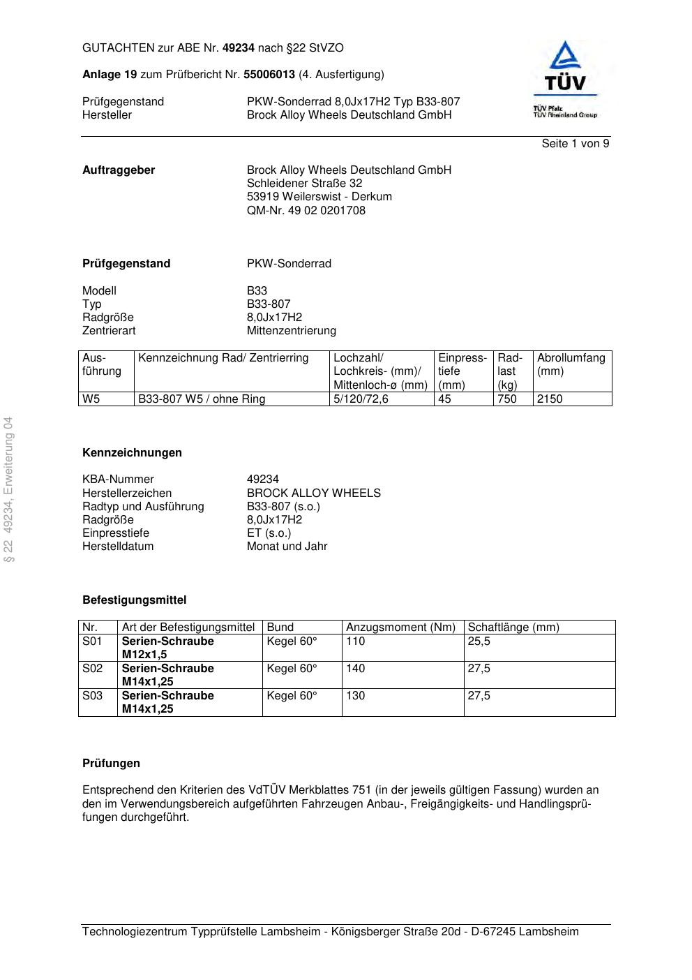 Dieses Gutachten (abe) bezieht sich auf die Alufelge Brock B33-807 in der Ausführung 8Jx17 ET 0, Mittenloch 0 mm (KBA 49234). Im PDF findest du typischerweise zulässige Reifengrößen, Auflagen/Anbauhinweise und – je nach Dokument – Hinweise zur Eintragung.