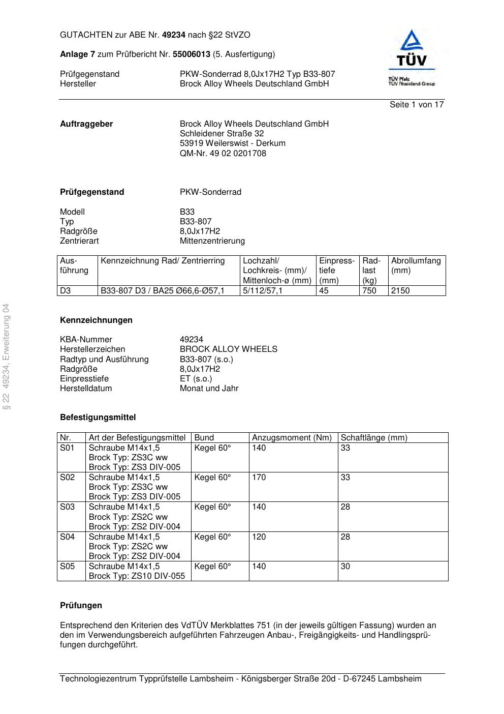 Dieses Gutachten (abe) bezieht sich auf die Alufelge Brock B33-807 in der Ausführung 8Jx17 ET 0, Mittenloch 0 mm (KBA 49234). Im PDF findest du typischerweise zulässige Reifengrößen, Auflagen/Anbauhinweise und – je nach Dokument – Hinweise zur Eintragung.