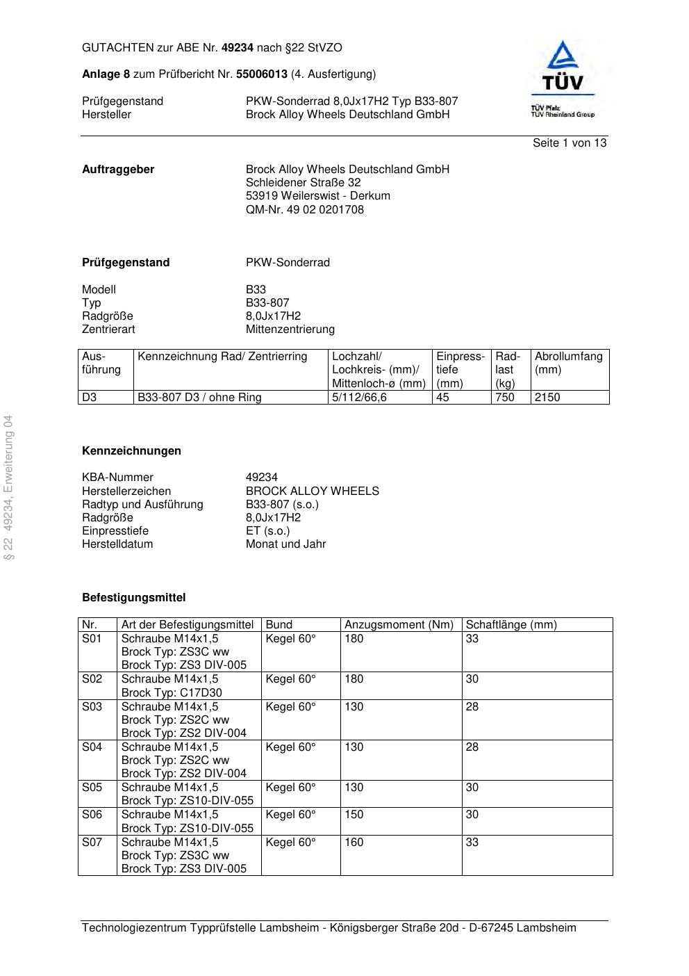 Dieses Gutachten (abe) bezieht sich auf die Alufelge Brock B33-807 in der Ausführung 8Jx17 ET 0, Mittenloch 0 mm (KBA 49234). Im PDF findest du typischerweise zulässige Reifengrößen, Auflagen/Anbauhinweise und – je nach Dokument – Hinweise zur Eintragung.