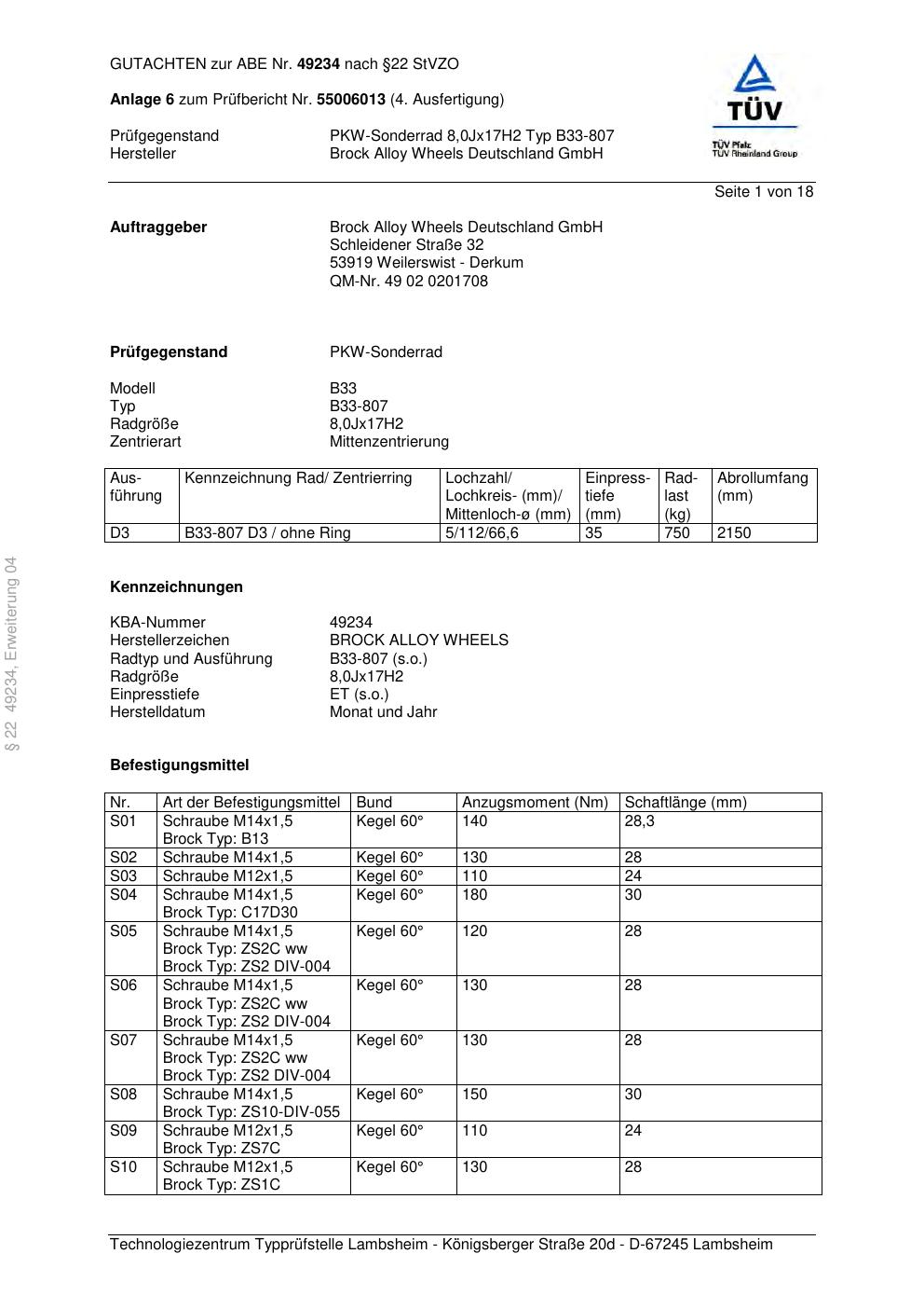 Dieses Gutachten (abe) bezieht sich auf die Alufelge Brock B33-807 in der Ausführung 8Jx17 ET 0, Mittenloch 0 mm (KBA 49234). Im PDF findest du typischerweise zulässige Reifengrößen, Auflagen/Anbauhinweise und – je nach Dokument – Hinweise zur Eintragung.