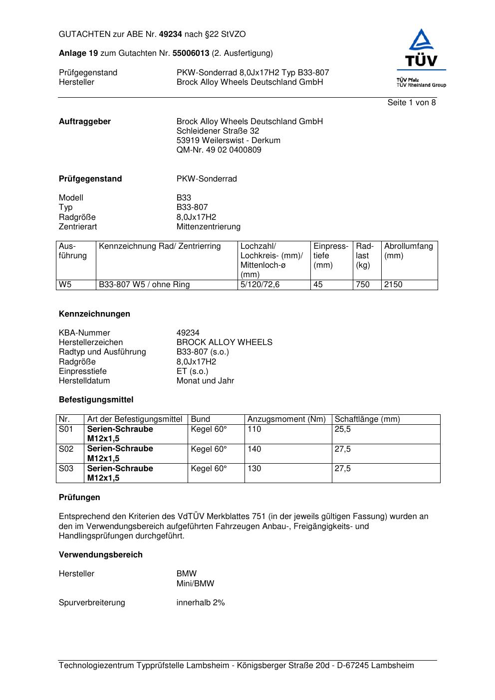 Dieses Gutachten (abe) bezieht sich auf die Alufelge Brock B33-807 in der Ausführung 8Jx17 ET 0, Mittenloch 0 mm (KBA 49234). Im PDF findest du typischerweise zulässige Reifengrößen, Auflagen/Anbauhinweise und – je nach Dokument – Hinweise zur Eintragung.