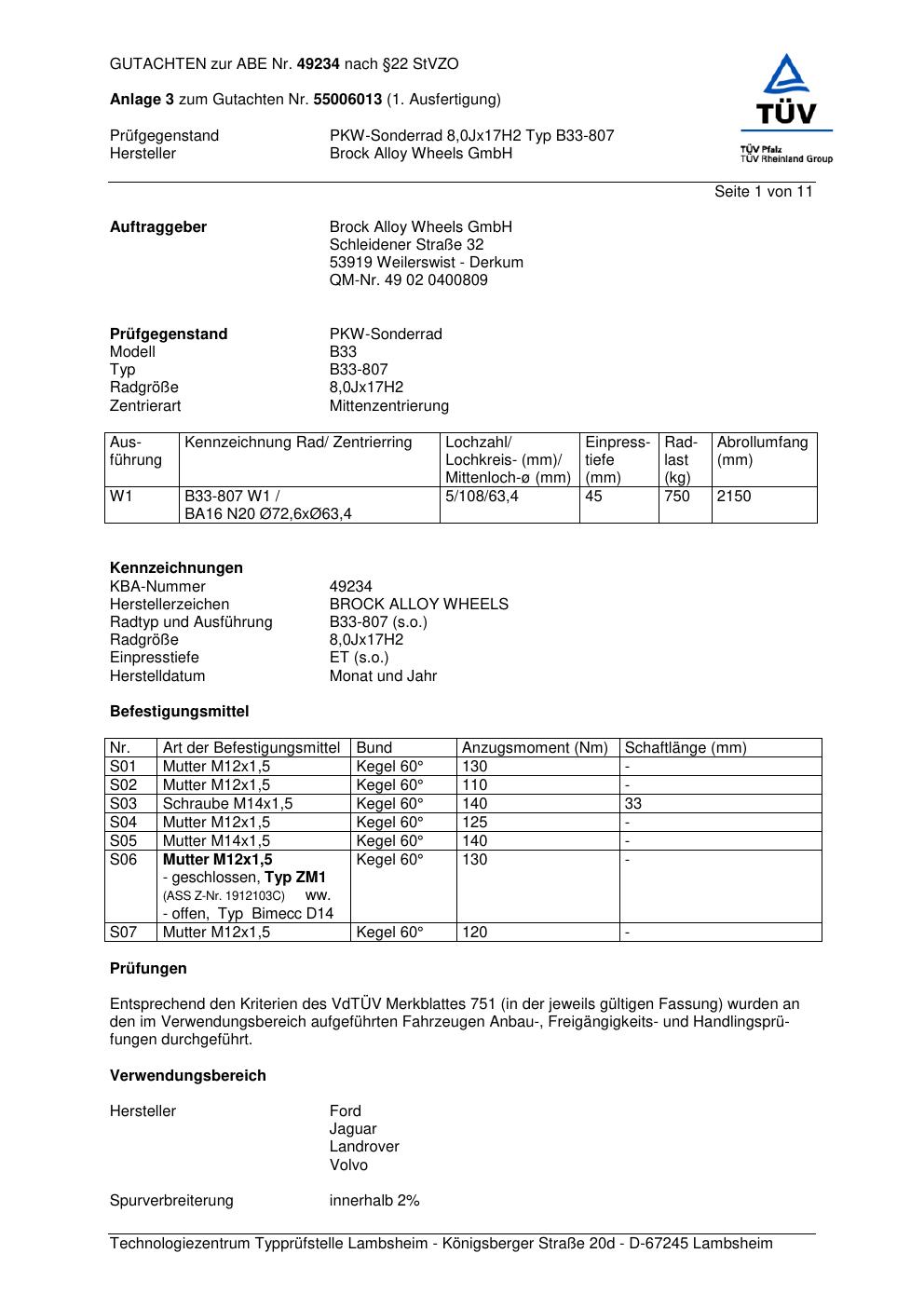 Dieses Gutachten (abe) bezieht sich auf die Alufelge Brock B33-807 in der Ausführung 8Jx17 ET 0, Mittenloch 0 mm (KBA 49234). Im PDF findest du typischerweise zulässige Reifengrößen, Auflagen/Anbauhinweise und – je nach Dokument – Hinweise zur Eintragung.