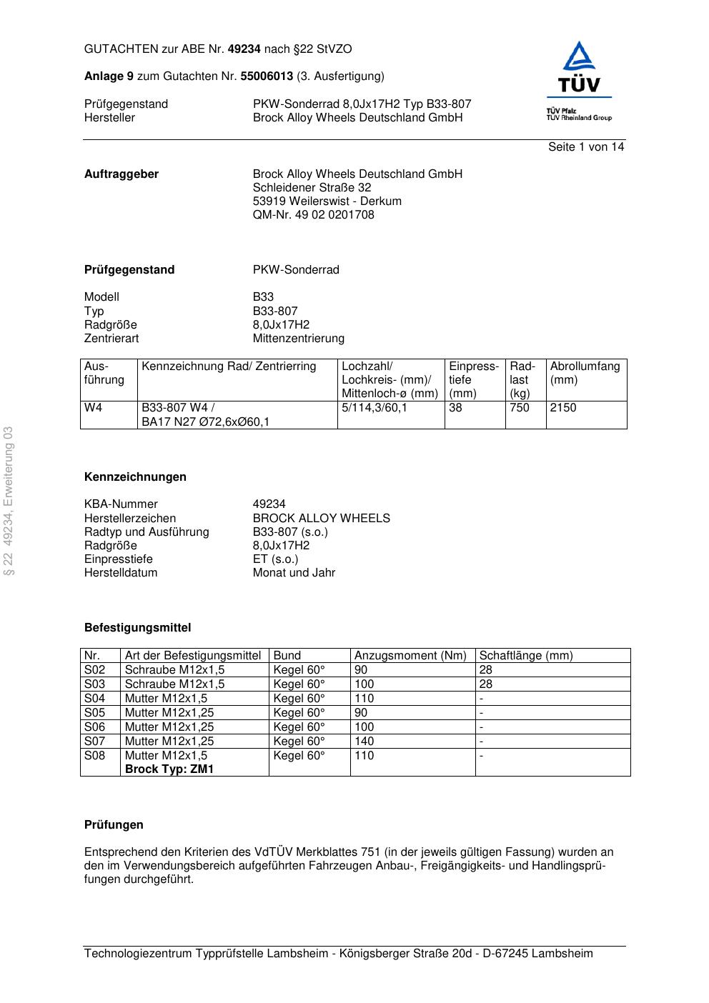 Dieses Gutachten (abe) bezieht sich auf die Alufelge Brock B33-807 in der Ausführung 8Jx17 ET 0, Mittenloch 0 mm (KBA 49234). Im PDF findest du typischerweise zulässige Reifengrößen, Auflagen/Anbauhinweise und – je nach Dokument – Hinweise zur Eintragung.